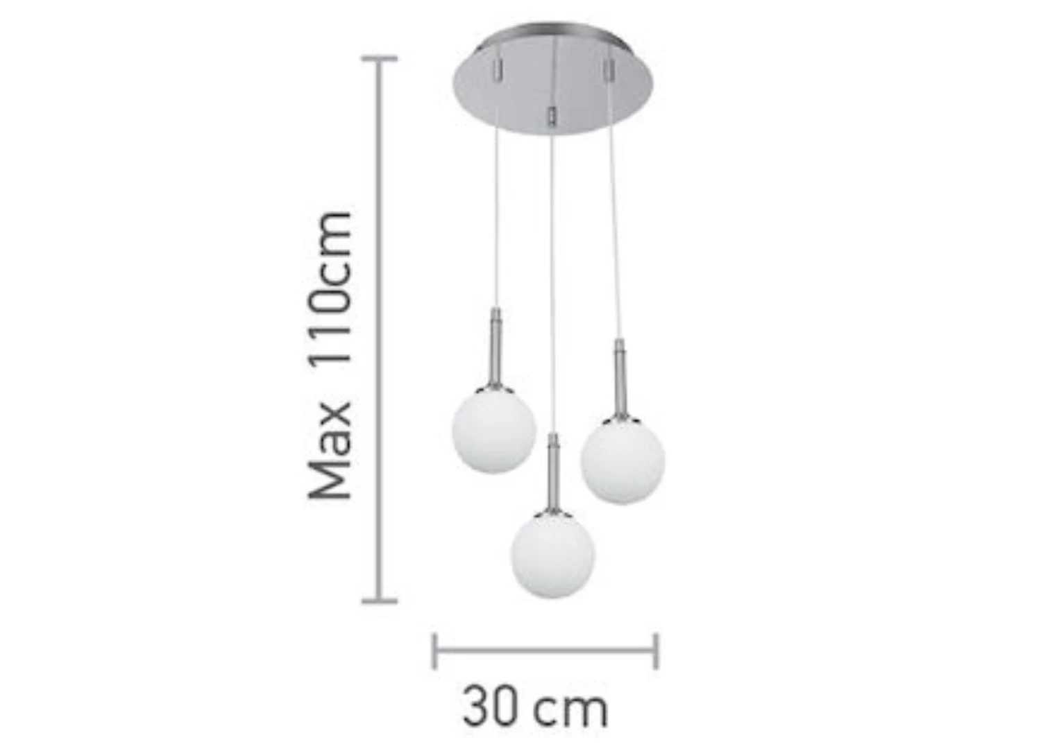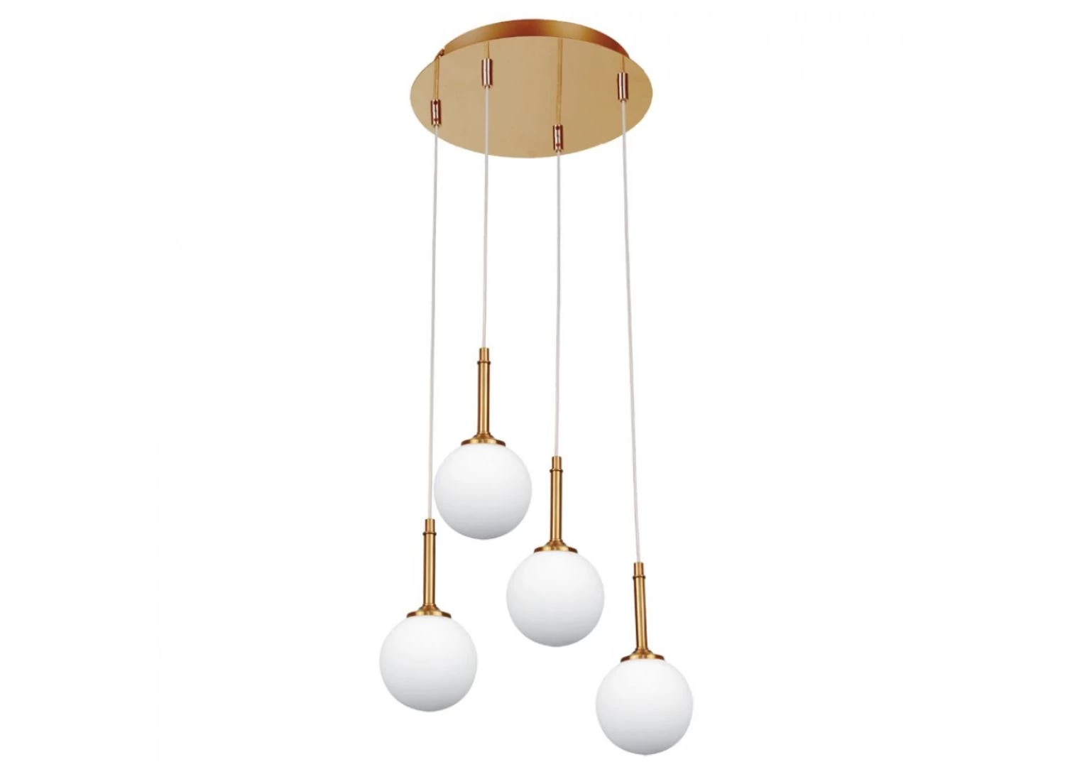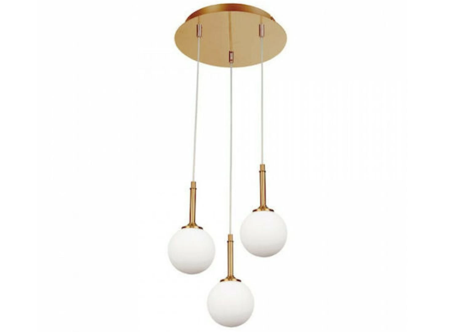 Πρόκειται για ένα χρυσαφί μεταλλικό φωτιστικό με λευκή οπαλίνα και τρεις λαμπτήρες. Το ύψος μπορεί να ρυθμιστεί ώστε να προσαρμοστεί στον μοντέρνο χώρο τοποθέτησής του.